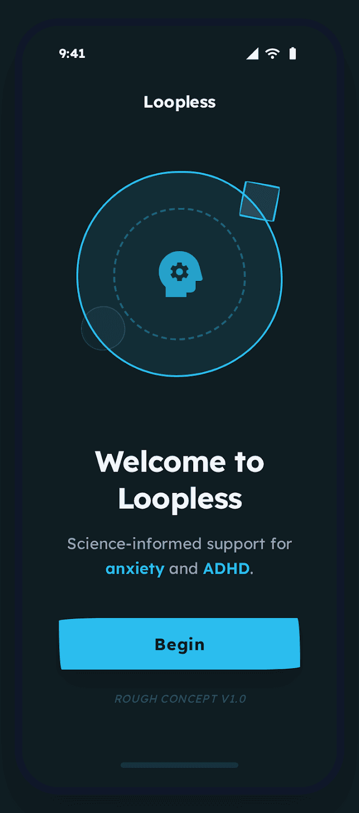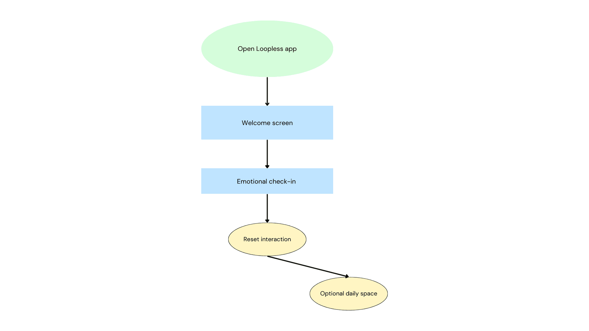 Loopless reframes emotional support as an immediate, low-effort interaction. Instead of requiring commitment, it provides a simple reset designed to interrupt the spiral in real time. The experience prioritises clarity, minimal decision-making, and instant engagement, allowing users to pause, ground themselves, and regain control.